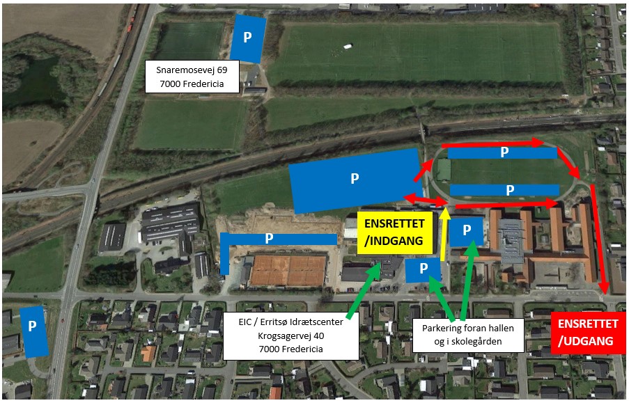 Krogsagervej 40 (Erritsø Idrætscenter 200 m) 100 pladser foran centeret + 40 i skolegården + 200 bag hallen